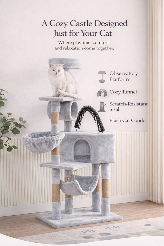 We offer a wide variety of cat trees and towers, ranging from basic models to luxury options with multiple levels, scratching posts, and play areas. Our products come in various sizes and styles to suit different spaces and cat preferences