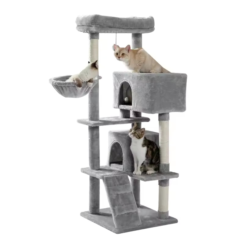 Safty & Stability: We design the cat tree with re-inforced posts and a thickened wide bottom plate, it is sturdy enough to allow cats jumping up and down freely without wobbly. Cats feel safe when climbing up and sleep in the condo, or snuggle in the hammock, or observing on the top perch.