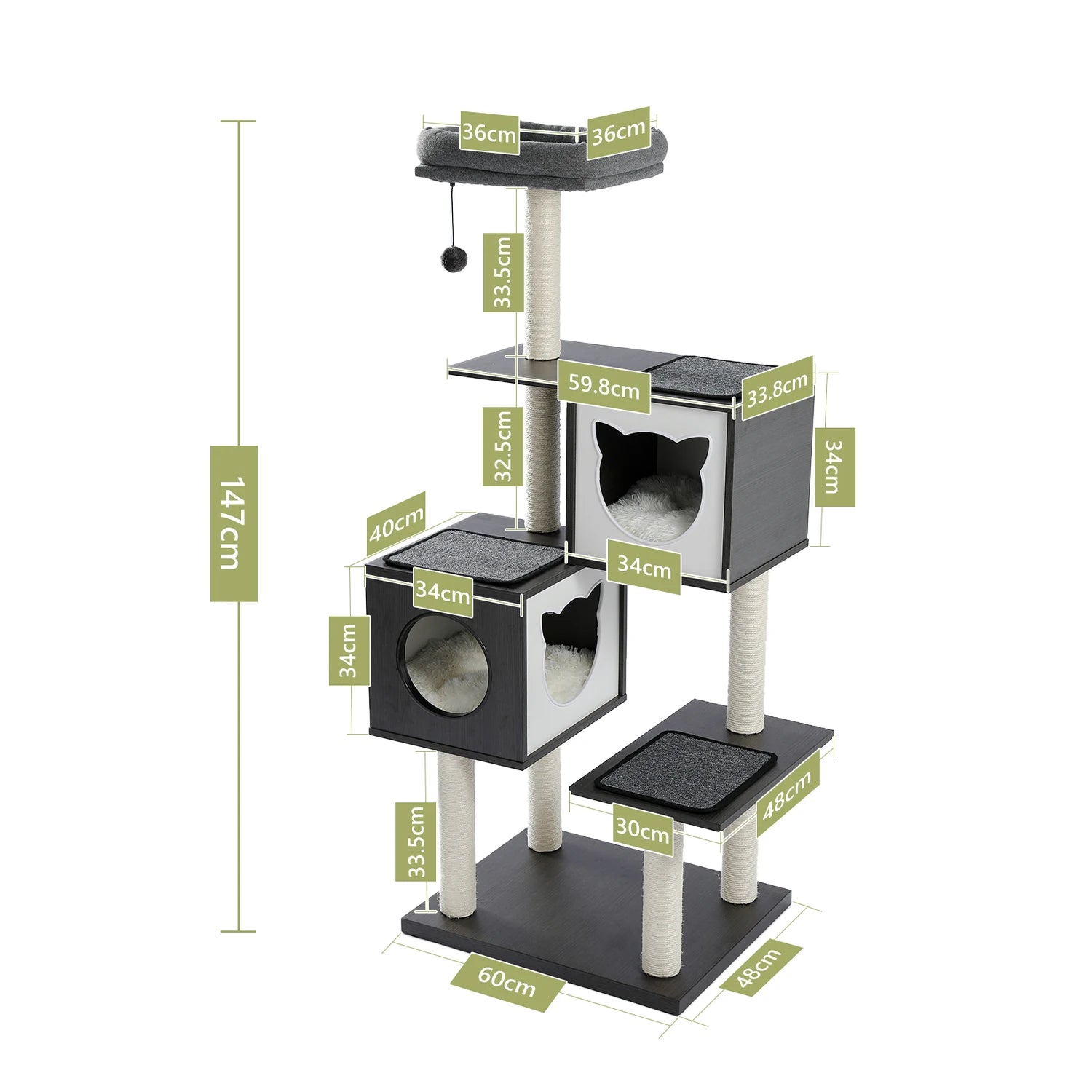 Adventure and Fun: The 5-level layout is ideal for energetic cats who love climbing and exploring. With 7 posts fully wrapped in sisal, this tree satisfies your cat's natural scratching instincts while keeping their claws healthy. The top perch provides a vantage point for surveying their domain, while the condos offer cozy hide-and-seek spots. A fuzzy dangling ball adds an extra layer of play and stimulation.